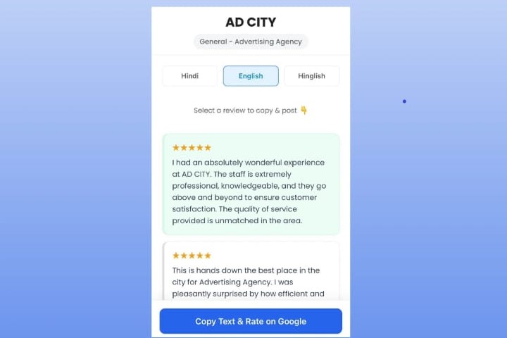 Review Generator restaurants, salons, clinics, shops, service providers aur multi-location businesses sabke liye perfectly kaam karta hai.
